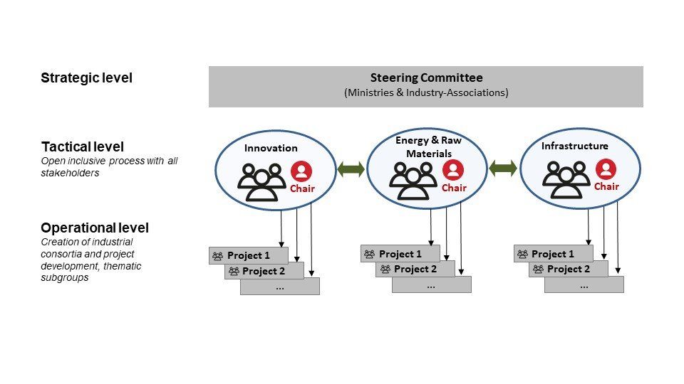 Below, an overview of the functioning of the governance mechanism is shown, combining the three levels of governance: Strategic, operational and activity level.